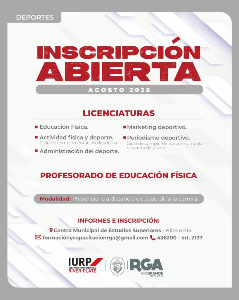 El Municipio de Río Grande y el Instituto Universitario River Plate (IURP) informan que permanecen abiertas…