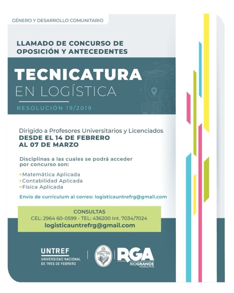 La Secretaría de Género y Desarrollo Comunitario informa que las inscripciones para concursar como docente de la Tecnicatura en Logística de la Universidad Nacional Tres de Febrero (UNTREF) están abiertas hasta el 7 de marzo.