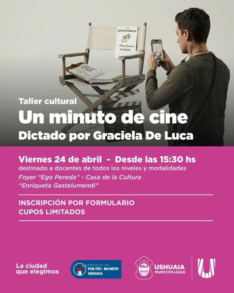En el marco de la 5° Edición del “Festival Internacional de Cine del Fin del Mundo”, la Municipalidad de Ushuaia a través de la Secretaría de Políticas Ambientales, Culturales y Educativas acompañará este viernes 24 de abril en el Foyer “Ego Pereda” de la Casa de la Cultura Enriqueta Gastelumendi a las 15:30 horas el Taller: “Un minuto de cine”.