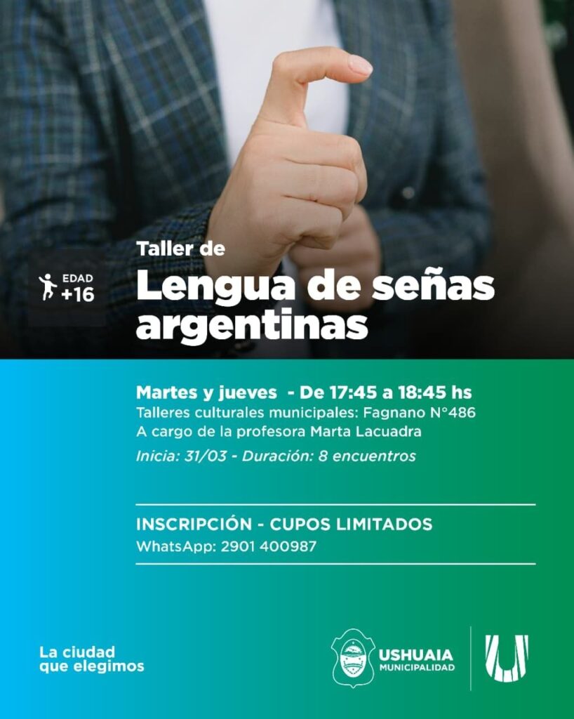 Con inicio el día martes 31 de marzo, se brindará el Taller de Lengua de señas argentinas a cargo de la profesora Marca Lacuadra. El mismo tendrá una duración de 8 encuentros y está destinado a jóvenes mayores de 16 años y adultos, dictándose en los talleres culturales municipales de calle Fagnano N° 486 los martes y jueves de 17:45 a 18:45 horas.