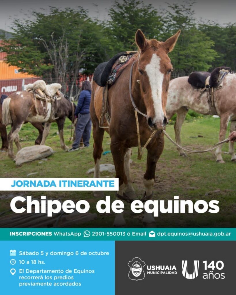 La Municipalidad de Ushuaia a través de la Secretaría de Políticas Sociales, Sanitarias y Derechos Humanos informa que llevará adelante jornadas de chipeo itinerante de equinos, que requerirán inscripción previa.