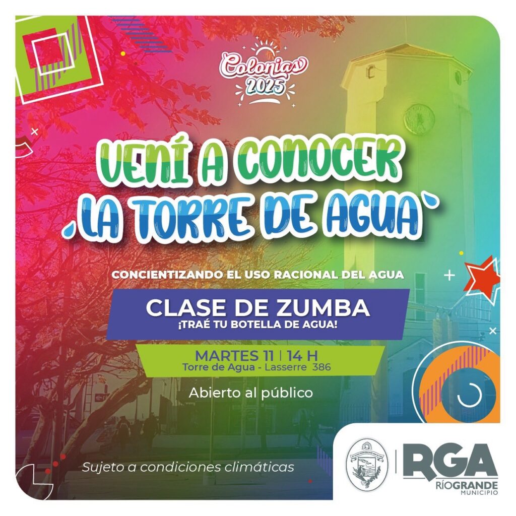A través de esta propuesta, el Municipio de Río Grande busca concientizar sobre el uso racional del agua y, al mismo tiempo, vecinos y vecinas podrán participar de una clase abierta de zumba adelante en la histórica Torre de Agua (Lasserre 386). La actividad se desarrollará este martes 11 de febrero, a las 14 horas.